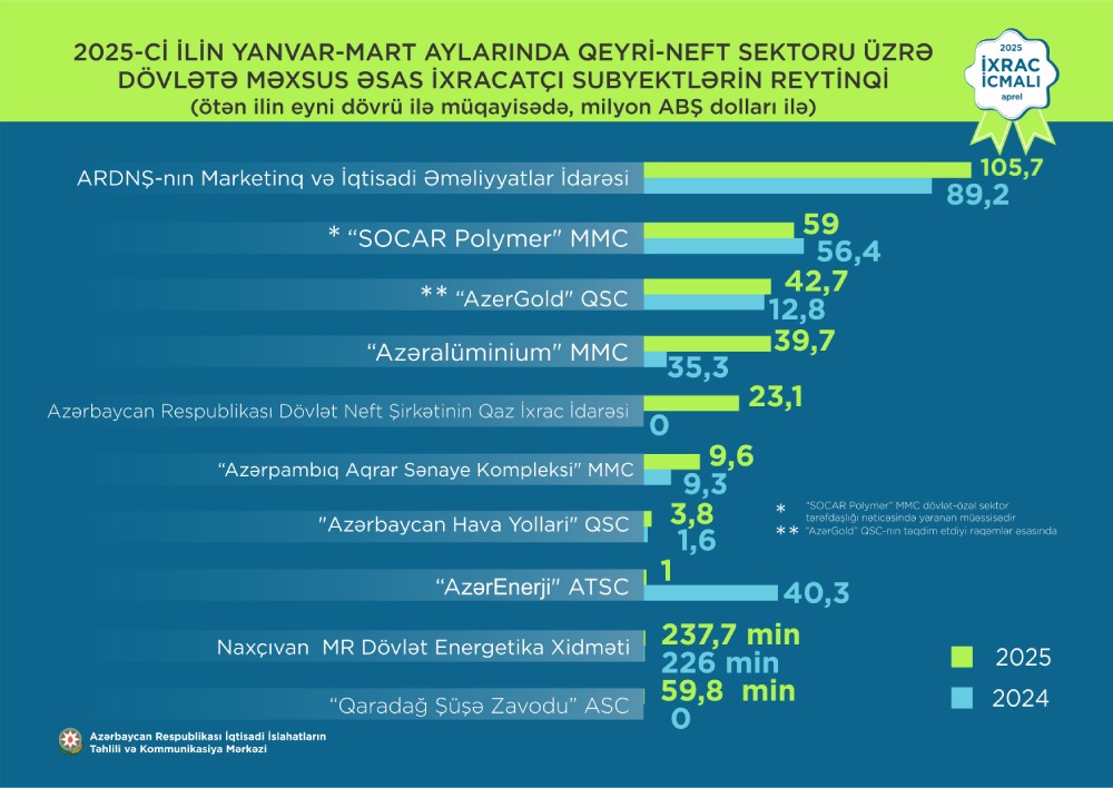 Marja.az xəbər verir ki, 2025-ci ilin yanvar-mart ayları üzrə hazırlanmış qeyri-dövlət ixracatçı subyektlərin reytinqində ilk onluqda aşağıdakı şirkətlər təmsil olunublar: "MKT İstehsalat Kommersiya" MMC,"Azərbaycan İnterneyşnl Mayninq Kompani Limited Şirkəti"nin Azərbaycan Respublikasındakı Nümayəndəliyi,"Baku Steel Company" QSC,"P-AQRO" MMC,"LEPIN LM" Məhdud Məsuliyyətli Cəmiyyəti,"Avrora" Məhdud Məsuliyyətli Cəmiyyəti, "Export Stream" Məhdud Məsuliyyətli Cəmiyyəti,"KHAN-EL" MMC,"BİNƏ AQRO" QSC,"Sahdag Sy" Məhdud Məsuliyyətli Cəmiyyəti.