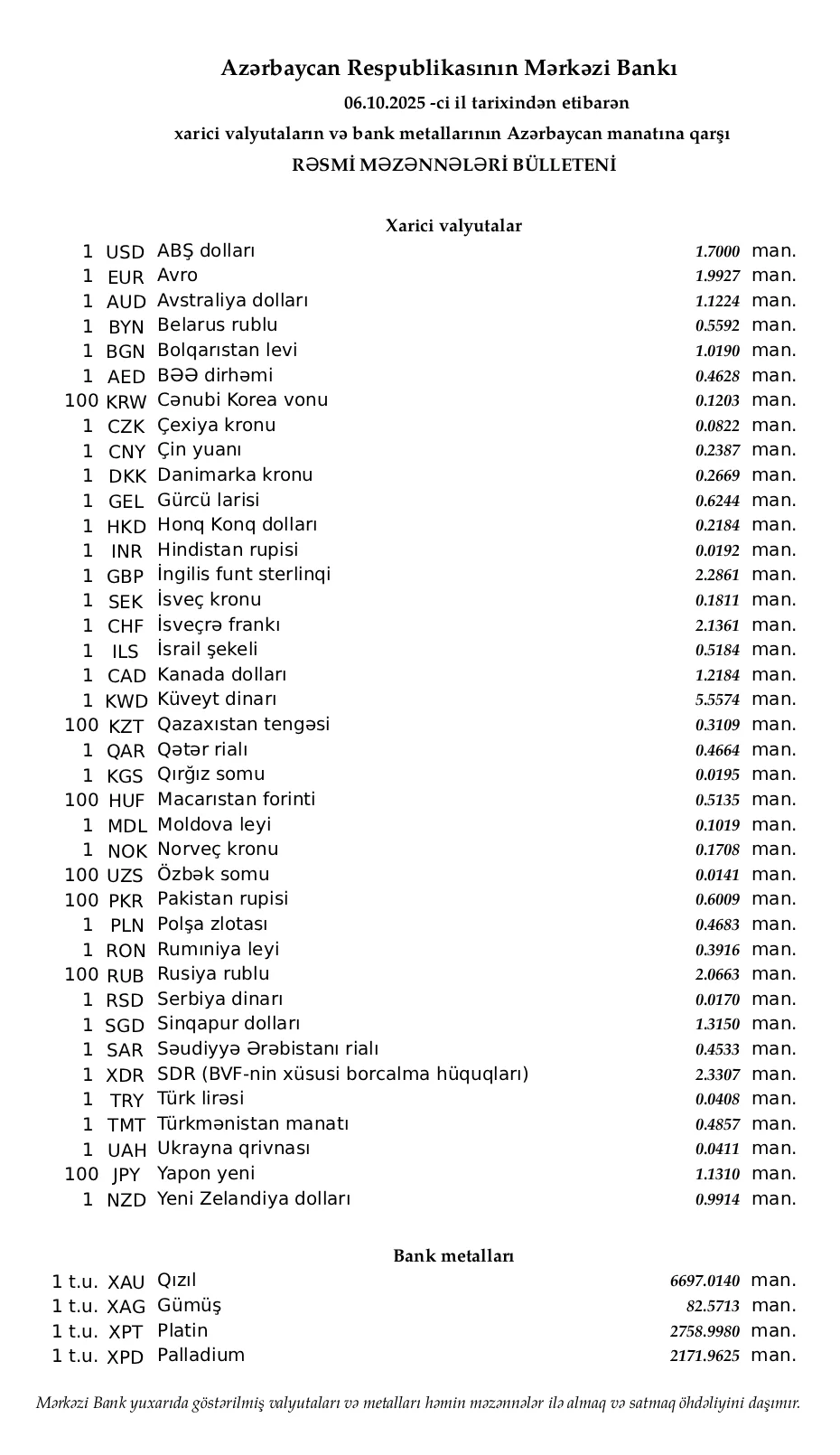 Rəsmi məzənnələr açıqlandı