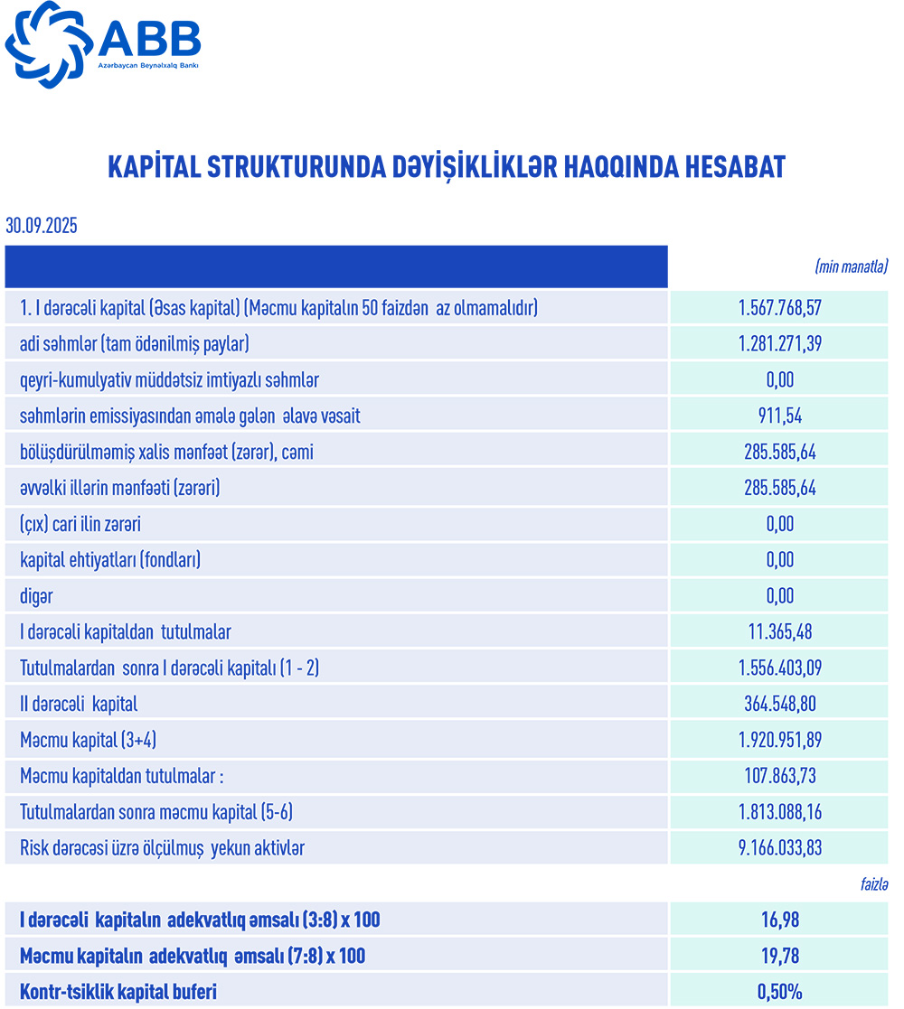 30 sentyabr 2025-ci il tarixində ABB 1 milyard 813 milyon 88 min manat məcmu kapitala malik olub. I dərəcəlikapitalınadekvatlıq əmsalı16,98%,məcmu kapitalınadekvatlıqəmsalı 19,78% təşkil edib.