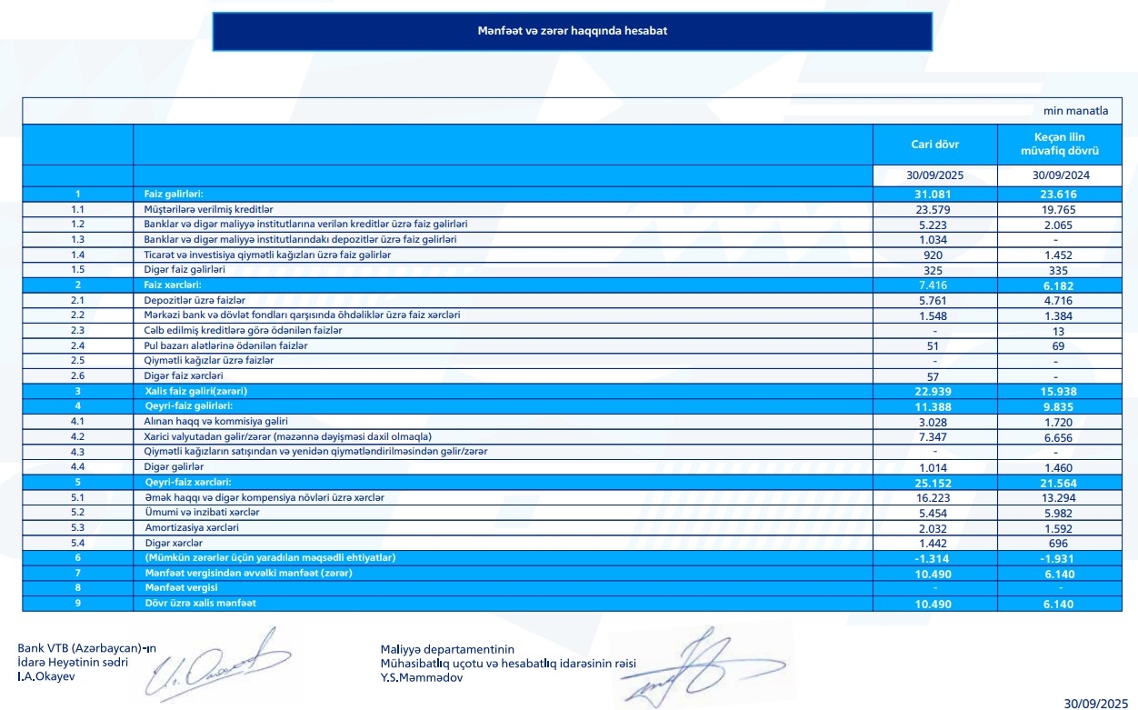 Bank VTB (Azərbaycan) 2025-ci ilin 9 ayında mənfəətini 70%-dən çox artırıb.