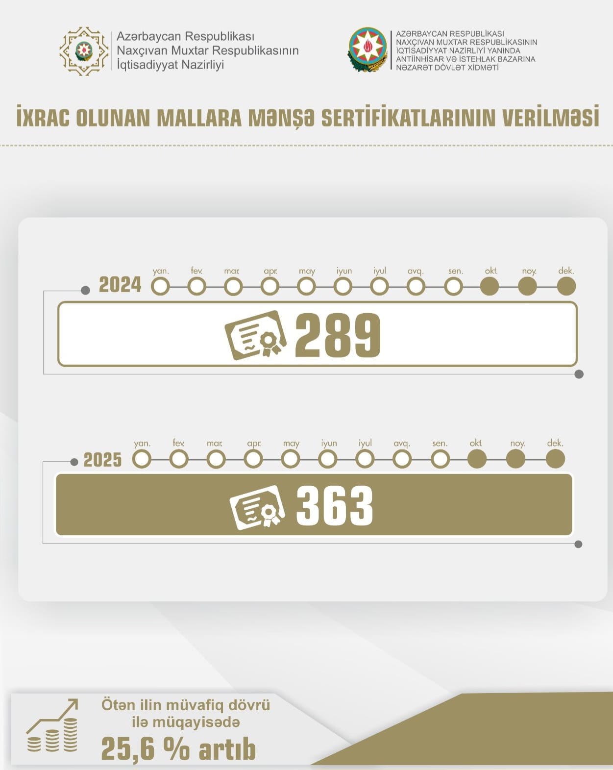 Cari ilin 9 ayında Naxçıvanda sahibkarlara 363 mənşə sertifikatı verilib ki, bu da ötən ilin müvafiq dövrü ilə müqayisədə 74 ədəd və ya 25,6 faiz çox olub.