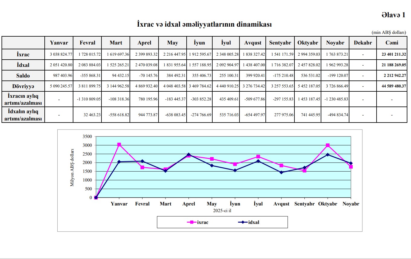 2025-ci ilin 11 ayı ərzində (yanvar-noyabr) Azərbaycanın xarici ticarət əməliyyatlarının həcmi 44 milyard 589 milyon 480 min ABŞ dolları təşkil edib. Xarici ticarət əməliyyatlarının həcmi ötən ilin müvafiq dövrünə nəzərən idxalın artması hesabına artıb. Azərbaycanın ixracı isə azalmaqda davam edib.