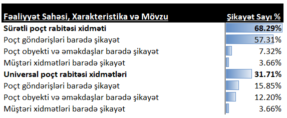 Poçt rabitəsi xidmətləri üzrə noyabr ayı ərzində 82 müraciət daxil olub. Bu da sistemə daxil olan ümumi şikayətlərin 16,9%-ni əhatə edir. Poçt rabitəsi xidmətlərində müraciətlərin 73.2%-i poçt göndərişlərinin gecikdirilməsi, çatdırılmaması və ya itirilməsi barədə olub. 7.3% müraciətlər müştəri xidmətləri, digər 19.5% isə ödənişlər, poçt rabitəsi operatorunun yerləşdiyi obyektin vəziyyəti, istifadə olunan proqram təminatının işləkliyi barədə qeydə alınıb. Ümumilikdə isə müraciətlərin 68,30%-i sürətli poçt xidmətləri, 31,70%-i universal poçt xidmətləri barədə olub.