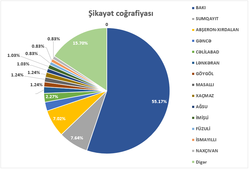 Beləliklə, müraciət edərkən ünvan olaraq vətəndaşların 55,17%-i Bakını, 7,64%-i Sumqayıtı, 7,02%-i Abşeron – Xırdalan ərazilərini seçiblər. Daxil olan müraciətlərin 80,8%-də vətəndaşlar 10 bölgəni (Bakı, Sumqayıt, Abşeron – Xırdalan, Gəncə, Cəlilabad, Lənkəran, Göygöl, Masallı, Xaçmaz, Ağsu) ünvan olaraq qeyd ediblər.