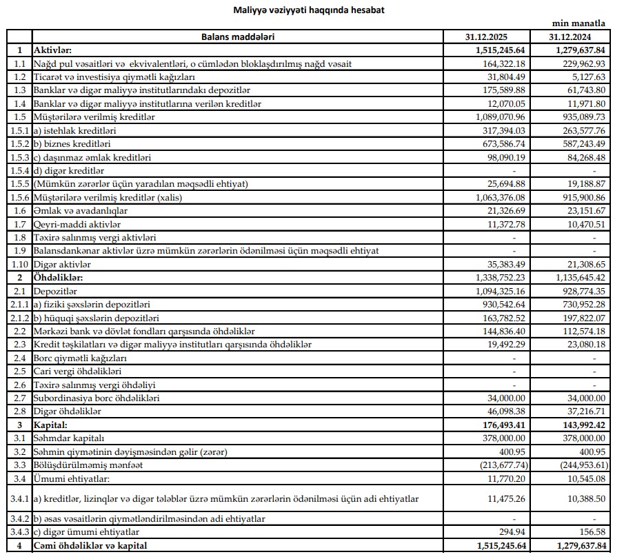 2025-ci ilin sonunda məcmu kapital 175 milyon 321 min manat təşkil edib ki, bu da 2024-cü ilin sonundakı 148 milyon 748 min manatla müqayisədə 26 milyon 573 min manat və ya 17,9 faiz artım deməkdir. Kapitalın artması bankın riskləri qarşılama qabiliyyətinin və tənzimləyici dayanıqlığının gücləndiyini göstərir.