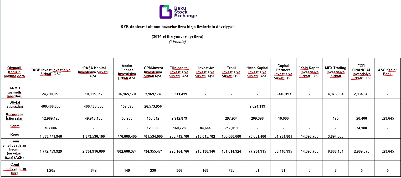 Qeyd edək ki, təqdim olunan göstəricilər 2026-cı ilin yanvar ayı üzrə Bakı Fond Birjasında həyata keçirilən əməliyyatları əhatə edir.