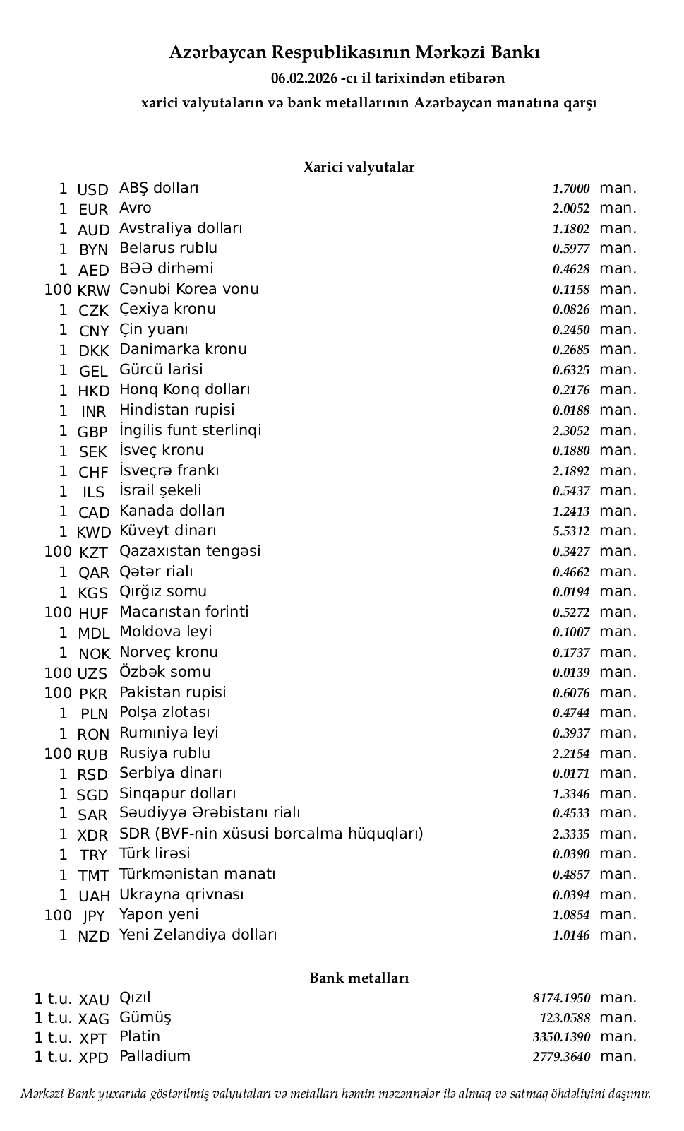 Rəsmi məzənnələr açıqlandı