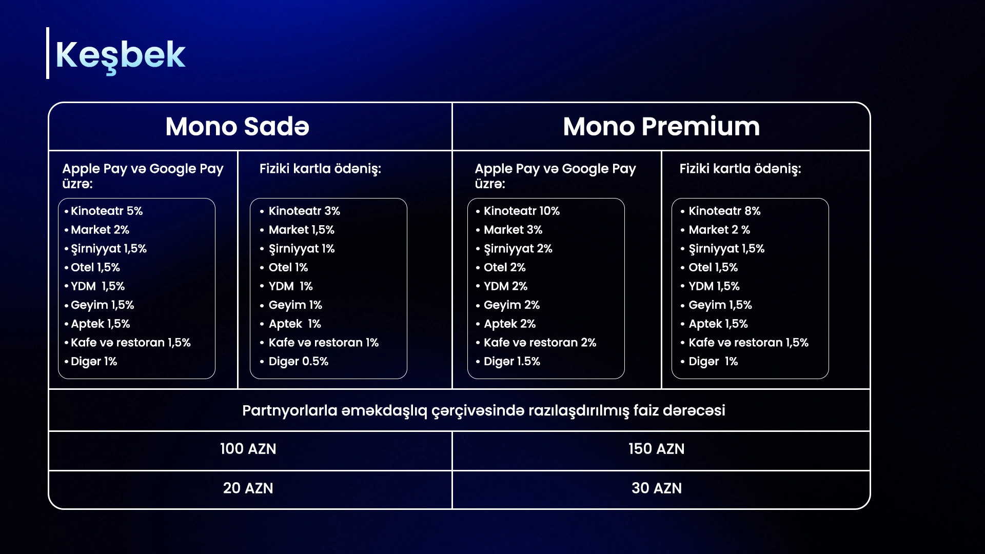 "Kartlarda kəşbek faizləri müxtəlifdir. Biz "Apple Pay" və Google Pay" üzrə daha yüksək keşbeklər təklif edirik. Müxtəlif tərəfdaşlar ilə razılaşdırılmış keşbek faizləri mövcuddur. Aylıq keşbek limiti "Sadə" kartda maksimum 100 manat, "Premium" kartda isə maksimum 150 manatdır. Bunlar da bazarda kifayət qədər rəqabətyönümlü rəqəmlərdir. Hər bir kateqoriya üzrə (market, geyim, gözəllik və s. ) keşbek limiti "Sadə" kartda aylıq 20 manat, "Premium kart"da isə aylıq 30 manat təşkil edir".
