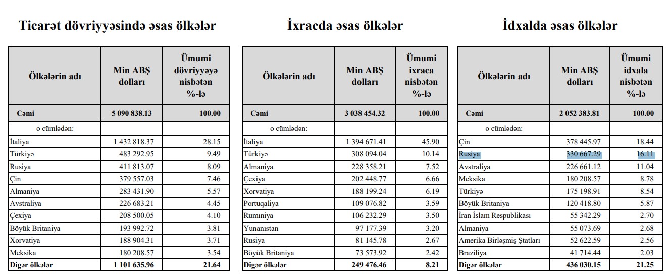 2025-ci ilin Yanvar ayında Azərbaycanın Rusiyadan idxalının dəyəri 330 milyon 667 min dollar təşkil etmişdi.