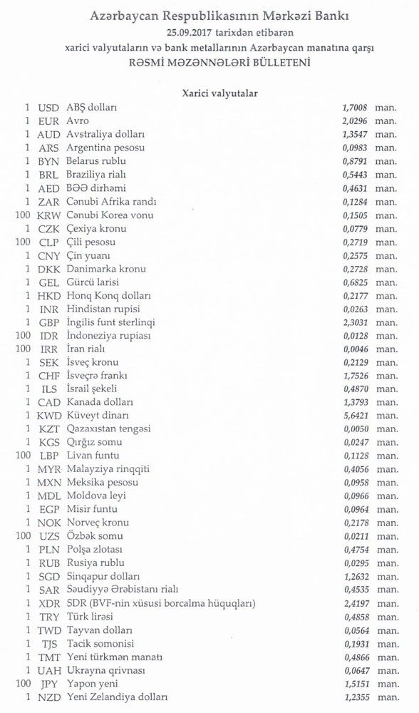 Sentyabrın 25-nə Mərkəzi Bankın açıqladığı rəsmi Dollar/manat məzənnəsi Sentyabrın 22-si ilə müqayisədə dəyişməyərək 1,7008 manat olub, Avro/manat məzənnəsi isə 2.0296 manata düşüb.