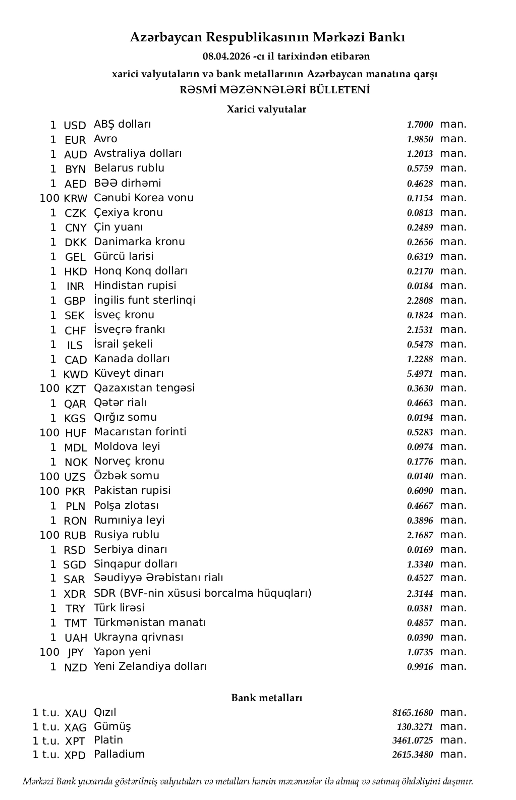 Rəsmi məzənnələr açıqlandı
