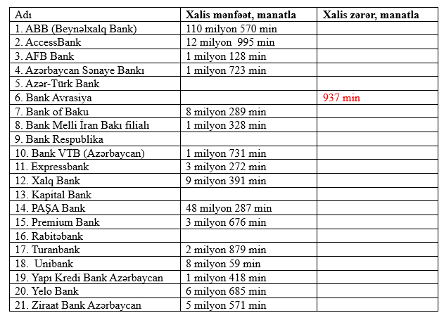 16 bank xalis mənfəət, 1 bank xalis zərər açıqladı - SİYAHI