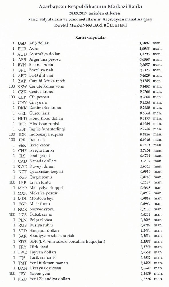 Sentyabrın 27-də rəsmi olaraq 1 dollar 1,7002 manata, 1 avro isə 2.0026 manata bərabər idi.