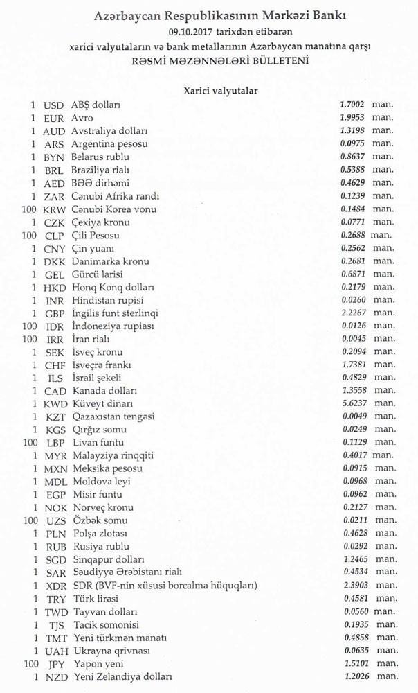 Oktyabrın 9-na Mərkəzi Bankın açıqladığı rəsmi Dollar/manat məzənnəsi Oktyabrın 6-sı ilə müqayisədə dəyişməyərək 1,7002 manat olub, Avro/manat məzənnəsi 1.9953 manata qalxıb, Rubl/manat məzənəsi isə 0,0292 manata düşüb.