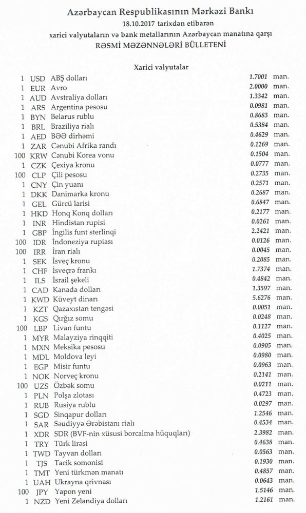 Oktyabrın 17-də rəsmi olaraq 1 dollar 1,7003 manata, 1 avro isə 2.0028 manata, 1 Rubl 0,0297 manata bərabər idi.