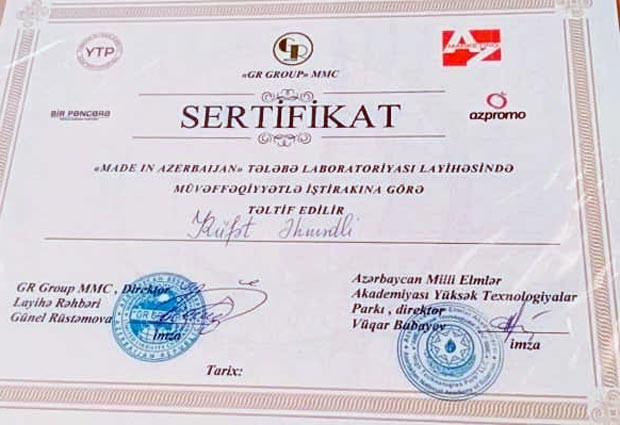 27.06.18 tarixində Azərbayan Milli Elmlər Akademiyası Yüksək Texnologiyalar Parkı, "GR Group" və "Azmarketing" şirkətlərinin birgə təşkilatçılığı ilə həyata keçirilən “Made in Azerbaijan” tələbə laboratoriyası layihəsinin yekun mərhələsi baş tutub.