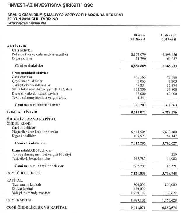 30 İyun 2018-ci il tarixində "İnvestAZ" 8 milyon 885 min manat cəmi aktivlərə malik olub. 30 İyun 2017-ci il tarixində Şirkətin 6 milyon 565 min manat cəmi aktivləri var idi.