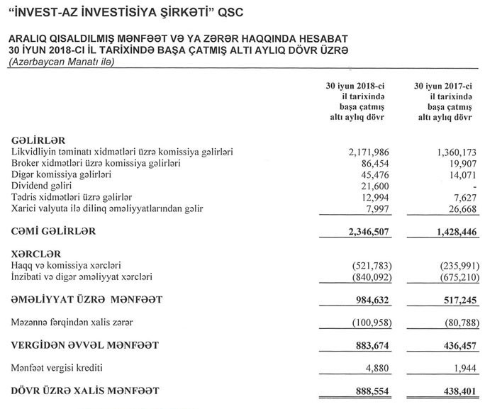 “İnvestAZ İnvestisiya Şirkəti” QSC 2018-ci ilin birinci yarısını 888 min 544 manat xalis mənfəətlə başa vurub. Halbuki, QSC 2017-ci ilin eyni dövründə 438 min 401 manat xalis mənfəət əldə etmişdi. Qısası, şirkətin xalis mənfəəti 2 dəfədən çox artıb.