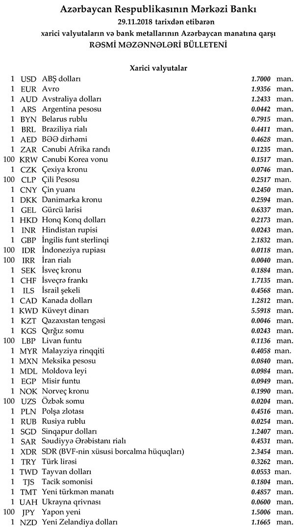 2018-ci ilin Noyabr ayının 29-na Mərkəzi Bankın açıqladığı rəsmi Dollar/Manat məzənnəsi Noyabrın 28-i ilə müqayisədə dəyişməyərək 1,7000 manat olub, Avro/manat məzənnəsi 1.9356 manata qalxıb, Rubl/manat məzənnəsi isə 0,0254 manatda qalıb.