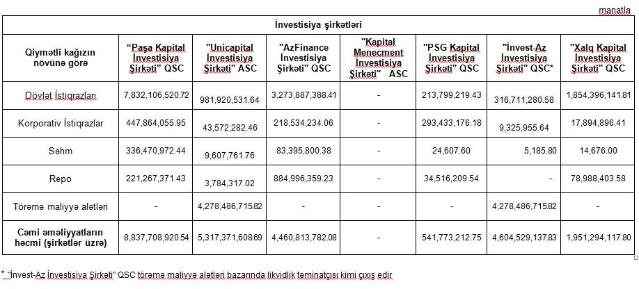 “Marja” Birjaya istinadən xəbər verir ki, 2018-ci il yanvar-dekabr ayları ərzində “Paşa Kapital İnvestisiya Şirkəti” 8 milyard 838 milyon manat dövriyyə ilə birinci, "Unicapital İnvestisiya Şirkəti" 4 milyard 278 milyon manat dövriyyə ilə ikinci, "İnvest-Az İnvestisiya Şirkəti" 4 milyard 604 milyon manat dövriyyə ilə üçüncü yeri tutub.