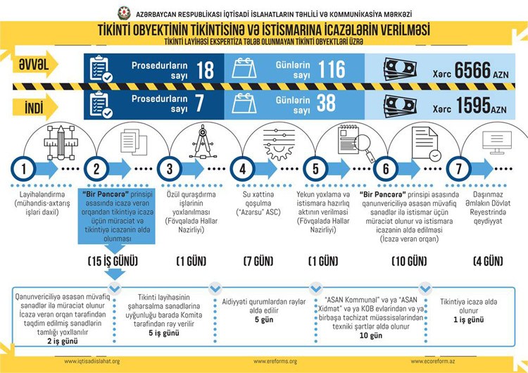 Qeyd edək ki, Prezidentin “Bəzi tikinti obyektlərinə tikintiyə icazə və tikinti obyektinin istismarına icazə verilməsi Qaydası” ilə bağlı 28 dekabr 2018-ci il tarixində imzaladığı Fərmana əsasən əsasən tikintiyə və tikinti obyektinin istismarına icazə ödənişsiz şəkildə aparılır, tikintiyə icazə alınması istiqamətində bütün aidiyyəti qurumlardan rəylər və texniki şərtlərin alınması tam olaraq sahibkarın iştirakı olmadan elektron qaydada həyata keçirilir. Eyni zamanda, tikintiyə və istismara icazənin əldə olunması üzrə tələb olunan prosedurların sayı 18-dən, 7-ə və günlərin sayı isə 116 gündən 38 günə azaldılmaqla, sahibkarlar üçün daha operativ, şəffaf və səmərəli mühit formalaşdırılır.