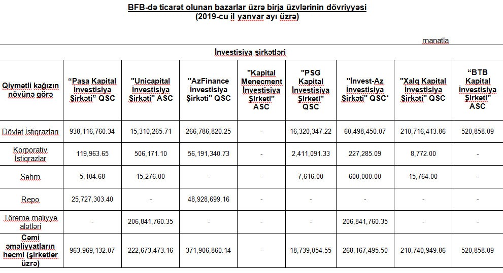 2019-cu il yanvar ayı üzrə Bakı Fond Birjasında (BFB) ticarət olunan bazarlar üzrə birja üzvlərinin dövriyyəsi açıqlanıb.