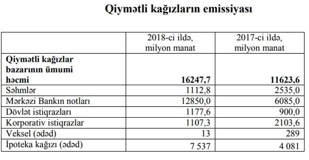 Maliyyə Bazarlarına Nəzarət Palatası tərəfindən təqdim etdiyi məlumatlara görə 2018-ci ildə ölkədə 16 milyard 247,7 milyon manatlıq qiymətli kağız buraxılışı qeydiyyata alınmışdır.