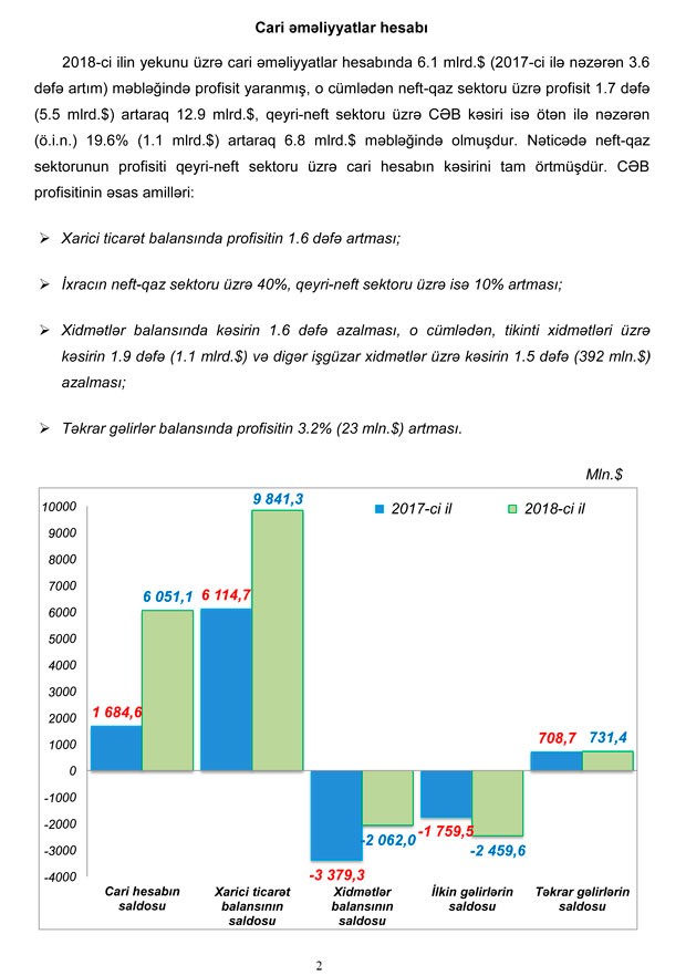 Hesabat dövründə cari əməliyyatlar hesabında 6,1 mlrd. dollarlıq (2017-ci ilə nəzərən 3,6 dəfə artım) profisit yaranıb. O cümlədən neft-qaz sektoru üzrə profisit 1,7 dəfə (5,5 mlrd. dollar) artaraq 12,9 mlrd.dollar, qeyri-neft sektoru üzrə CƏB kəsiri isə ötən ilə nisbətən 19,6% (1,1 mlrd. dollar) artaraq 6,8 mlrd. dollar məbləğində olub. Nəticədə neft-qaz sektorunun profisiti qeyri-neft sektoru üzrə cari hesabın kəsirini tam örtüb.