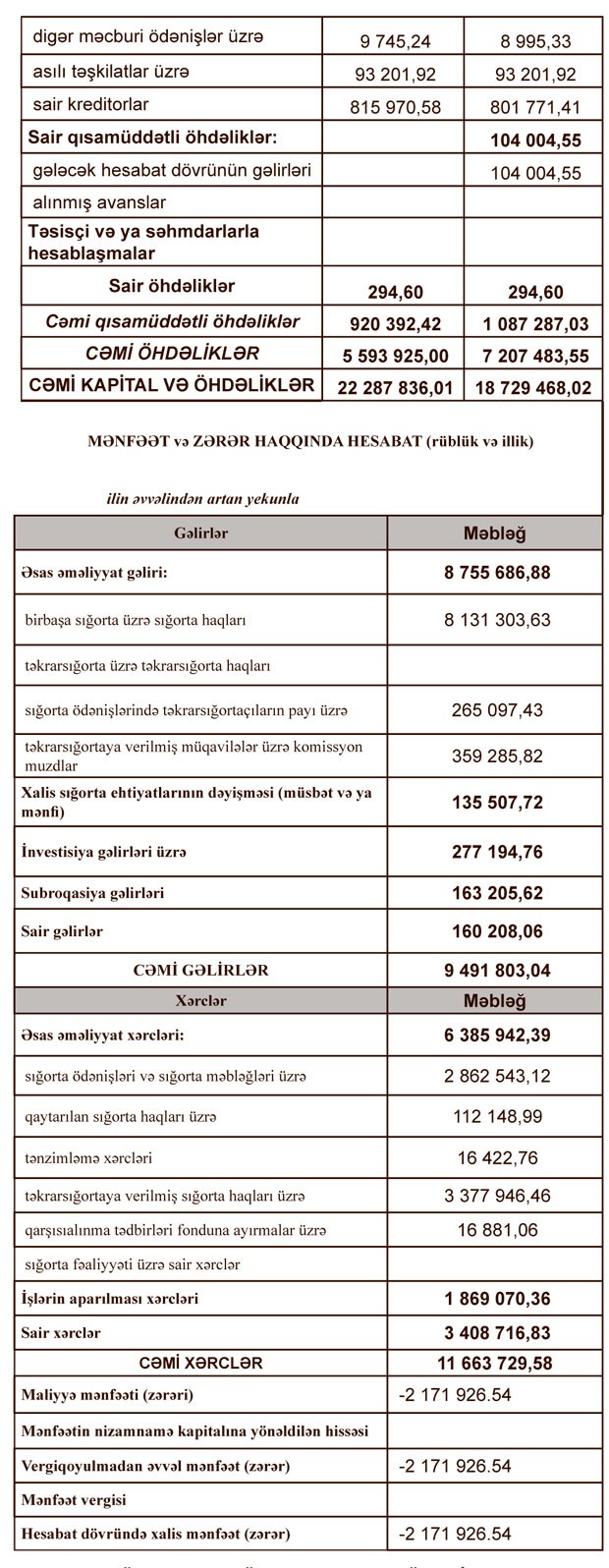 İllik müqayisədə, şirkətin topladığı sığorta haqları 7 milyon 242 min manatdan 8 milyon 755 min manata yüksəlib, sığorta ödənişləri isə 3 milyon 710 min manatdan 2 milyon 862 min manata düşüb.