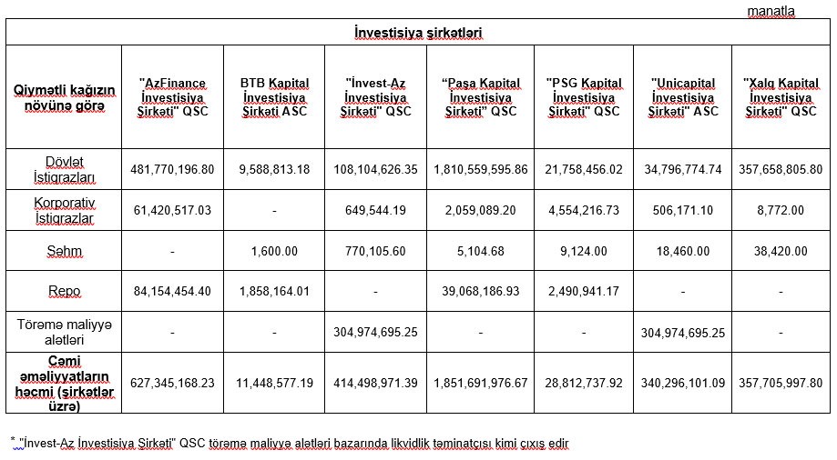 627 milyon 345 min manatlıq dövriyyə ilə "AzFinance İnvestisiya Şirkəti" 2-ci, 414 milyon 498 min manatlıq dövriyyə ilə "İnvest-Az İnvestisiya Şirkəti" 3-cü, 357 milyon 705 min manatlıq dövriyyə ilə "Xalq Kapital İnvestisiya Şirkəti" 4-cü, 340 milyon 296 min manatlıq dövriyyə ilə "Unicapital İnvestisiya Şirkəti" 5-ci, 28 milyon 812 min manatlıq dövriyyə ilə "PSG Kapital İnvestisiya Şirkəti" 6-cı, 11 milyon 448 min manatlıq dövriyyə ilə "BTB Kapital İnvestisiya Şirkəti" 7-ci yeri tutub.