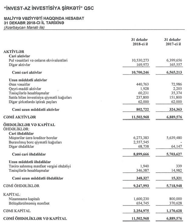 31 Dekabr 2018-ci il tarixinə "İnvest-AZ"ın cəmi aktivləri 11 milyon 503 min manat olub ki, bu da illik müqayisədə 66,95% çoxdur. Hesabat dövründə investisiya şirkətinin öhdəlikləri 61,7% artaraq 9 milyon 248 min manata, balans kapitalı isə 92,6% artaraq 2 milyon 255 min manata, o cümlədən nizamnamə kapitalı 2 dəfə artaraq 1,6 milyon manata çatıb.