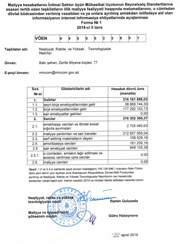 Nəqliyyat, Rabitə və Yüksək Texnologiyalar Nazirliyi 2018-ci ili 140 min manat zərər ilə başa vurub.