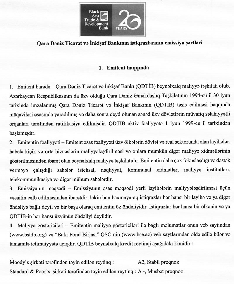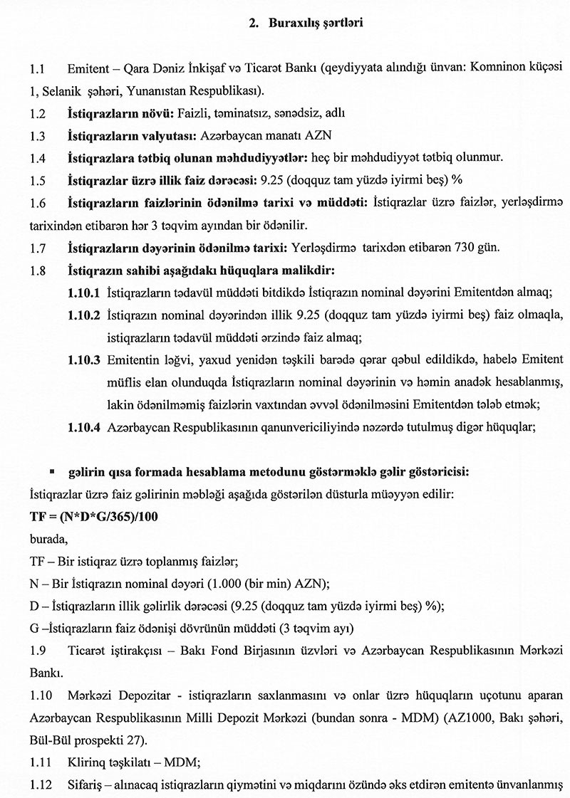 Qara Dəniz Ticarət və İnkişaf Bankının Azərbaycan manatı ilə emissiya etdiyi istiqrazlar 730 gün müddətində dövriyyədə olacaq.
