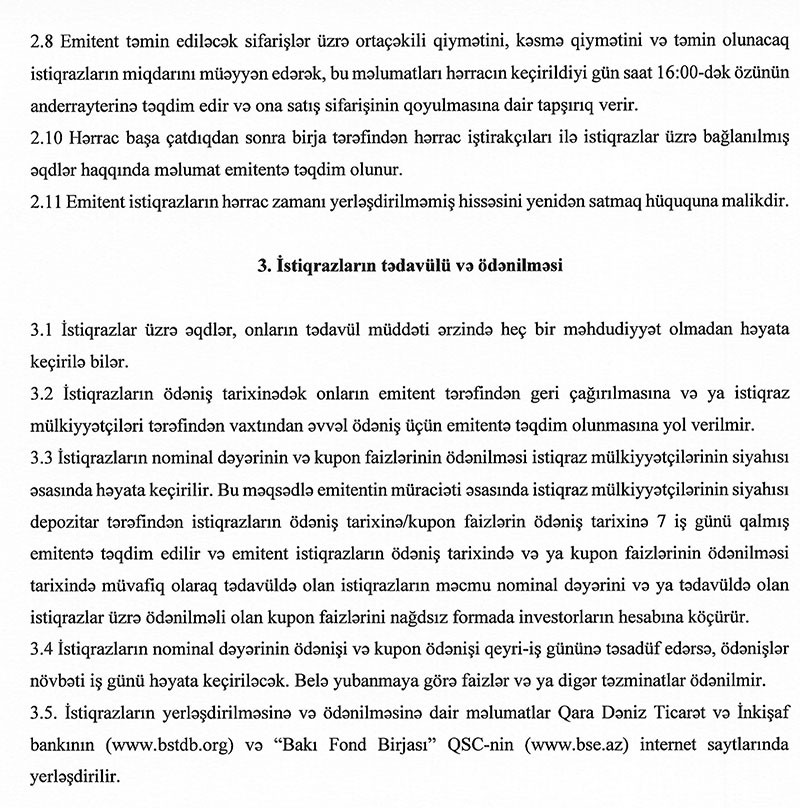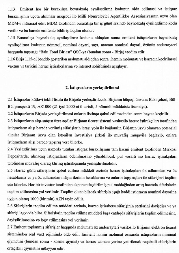 Məlumata görə, söhbət hər birinin nominal dəyəri 1 000 manat olan 10 min ədəd faizli, təminatsız, sənədsiz, adlı istiqrazdan gedir. Onların illik gəlirliliyi 9,25% olacaq. Faiz ödənişləri 3 aydan bir həyata keçiriləcək.