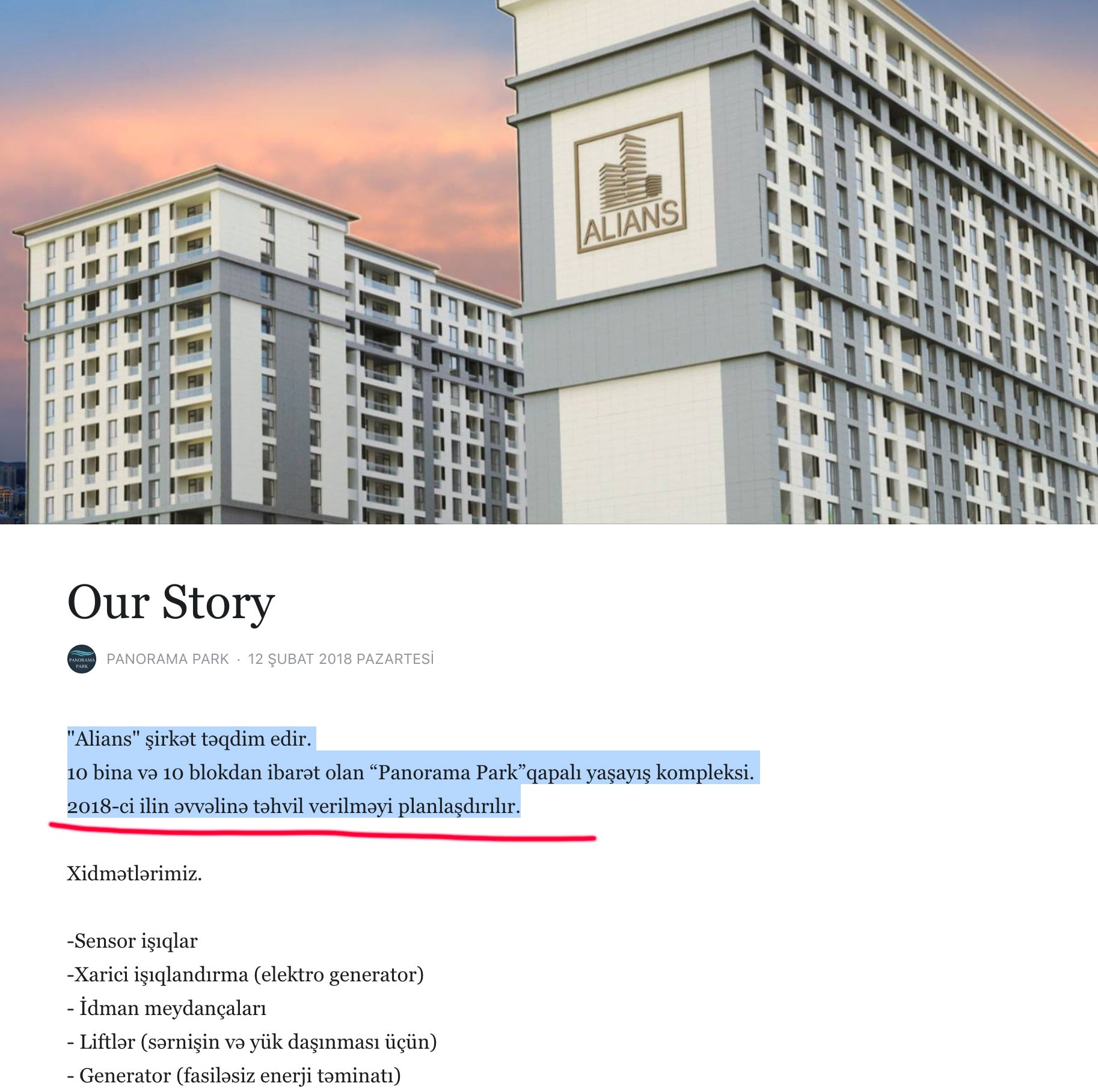 Qeyd edək ki, "Alians" şirkətinin inşa etdiyi “Panorama Park” qapalı yaşayış kompleksi 10 bina və 10 blokdan ibarət olmalıdır. Şirkət kompleksin 2018-ci ilin əvvəlinə təhvil verəcəyini açıqlamışdı.