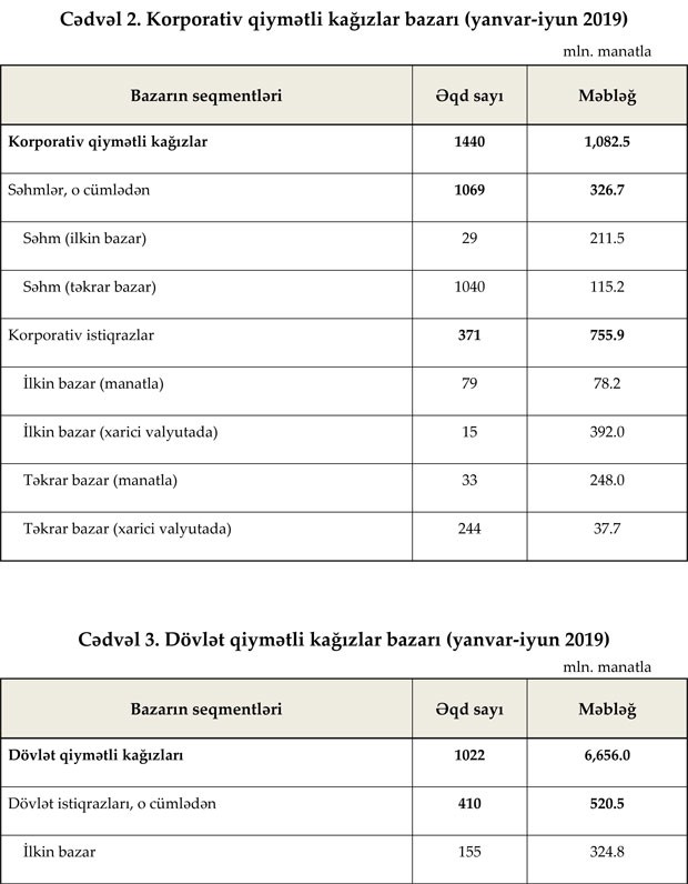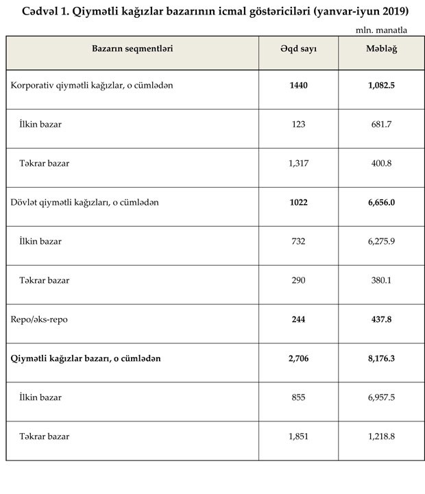 Əməliyyatların 85%-i (6 milyard 957,5 milyon manat) ilkin bazarda, 15%-i (1 milyard 218,8 milyon manat) isə təkrar bazarda aparılıb. Cari ilin yanvar-iyun ayları ərzində qiymətli kağızlarla ilkin bazar əməliyyatları ötən ilin müvafiq dövrü ilə müqayisədə 7%, təkrar bazar əməliyyatları isə 11% artıb.
