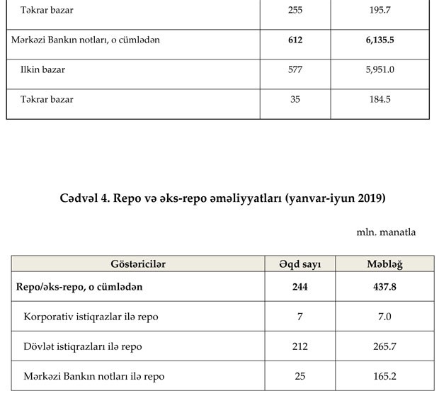 Hesabat dövründə qiymətli kağızlarla keçirilən repo əməliyyatlarının ümumi məbləği 437,8 milyon manat olub. Dövlət istiqrazları ilə repo əməliyyatların həcmi ötən ilin müvafiq dövrü ilə müqayisədə artım nümayiş etdirərək 266 milyon manat təşkil edib.