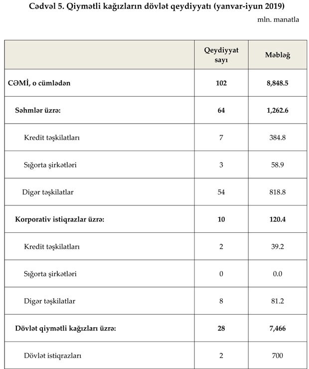 Hesabat dövründə dövlət qiymətli kağızları bazarında əqdlərin həcmi ötən illə müqayisədə 11% artaraq 6 milyard 656 milyn manat təşkil edib. Bunun 520 milyon manatını dövlət istiqrazları, 6 milyard 135,5 milyon manatını isə Mərkəzi Bankın notları təşkil edib. Dövr ərzində dövlət istiqrazlarının yerləşdirilməsi üzrə 17 hərrac, Mərkəzi Bankın notlarının yerləşdirilməsi üzrə isə 26 hərrac keçirilib və müvafiq olaraq, 325 milyon manat və 5 milyard 951 milyon manat məbləğində yerləşdirmə olub.