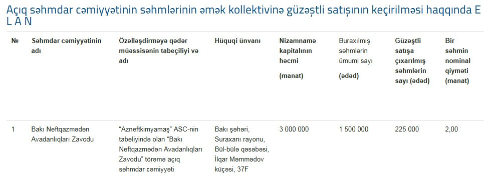 "Marja" Komitənin elanına istinadən xəbər verir ki, “Azneftkimyamaş” ASC-nin tabeliyində olan “Bakı Neftqazmədən Avadanlıqları Zavodu” törəmə açıq səhmdar cəmiyyətinin 3 000 000 manatlıq nizamnamə kapitalı hər birinin nominal qiyməti 2 manat olan 1 500 000 ədəd səhmdən ibarətdir. Güzəştli satışa çıxarılmış səhmlərin sayı 225 000 ədəddir.