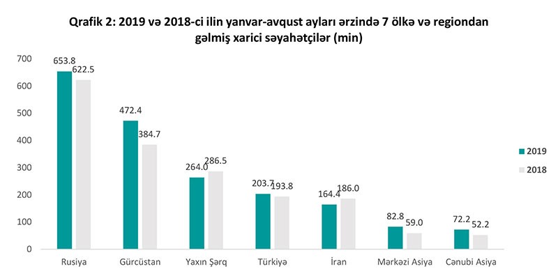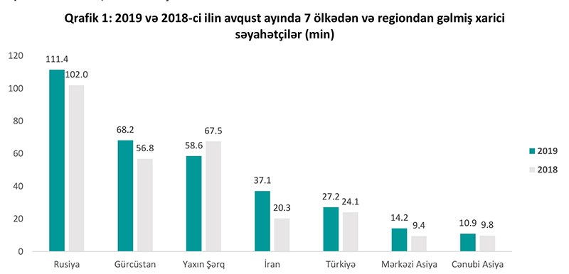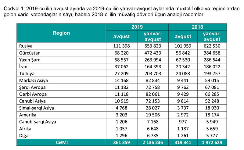 2019-cü ilin yanvar-avqust dövrü ərzində Azərbaycana səfər edən xarici vətəndaşların sayı 8.3% artaraq 2.1 milyona çatıb. Gələn əcnəbilərin yarısından çoxu, daha dəqiq desək, 53%-i Rusiya (653 min) və Gürcüstanın (472 min) payına düşür.