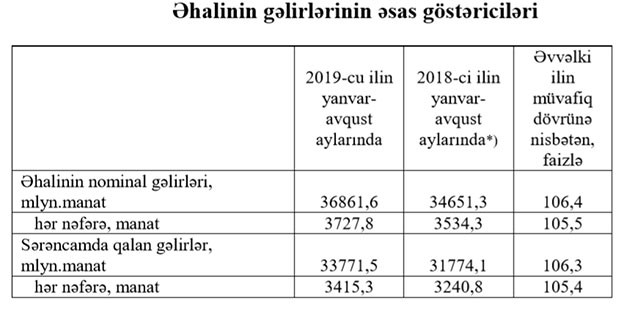 İlkin məlumatlara görə, 2019-cu ilin yanvar-avqust aylarında ölkə əhalisinin nominal gəlirləri əvvəlki ilin eyni dövrünə nisbətən 6,4 faiz artaraq 36 milyard 861,6 milyon manat təşkil etmiş, əhalinin hər nəfərinə orta hesabla 3727,8 manatlıq gəlir düşmüşdür.