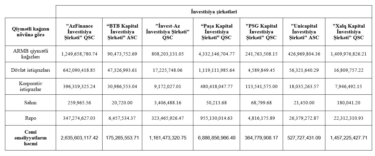 “Birja”dan “Marja”ya daxil olmuş məlumata görə, 6 milyard 887 milyon manat dövriyyə ilə “Paşa Kapital İnvestisiya Şirkəti” QSC birinci yeri tutub. “Paşa Kapital"ın ardınca 2 milyard 636 milyon manat dövriyyə ilə "AzFinance İnvestisiya Şirkəti" QSC, 1 milyard 457 milyon manat dövriyyə ilə "Xalq Kapital İnvestisiya Şirkəti" QSC gəlir.