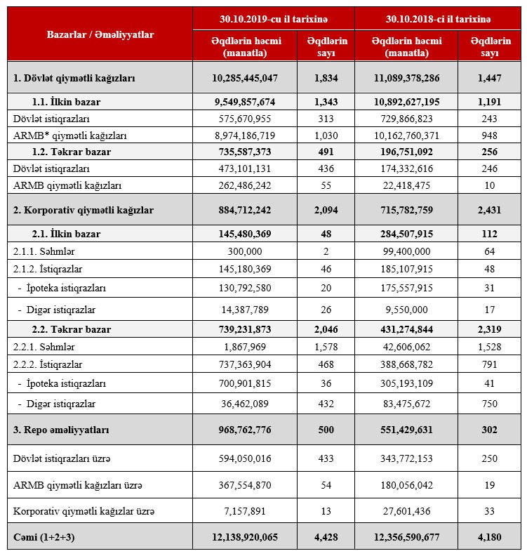 “Nəticə olaraq, 2019-cu ilin ilk 10 ayında dövlət qiymətli kağızların ilkin bazarında yerləşdirmələrin həcmində ötən ilə nəzərən azalma müşahidə olumasına baxmayaraq, dövlət qiymətli kağızların təkrar bazarında ticarət həcmi 274%, korporativ qiymətli kağızlar bazarında 24% və repo əməliyyatlarında isə 76% böyümə qeydə alınmışdır”,- Birjanın məlumatında deyilir.