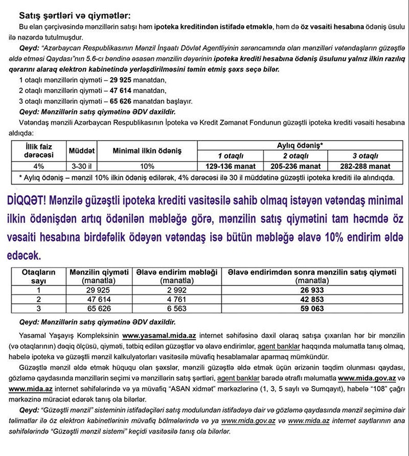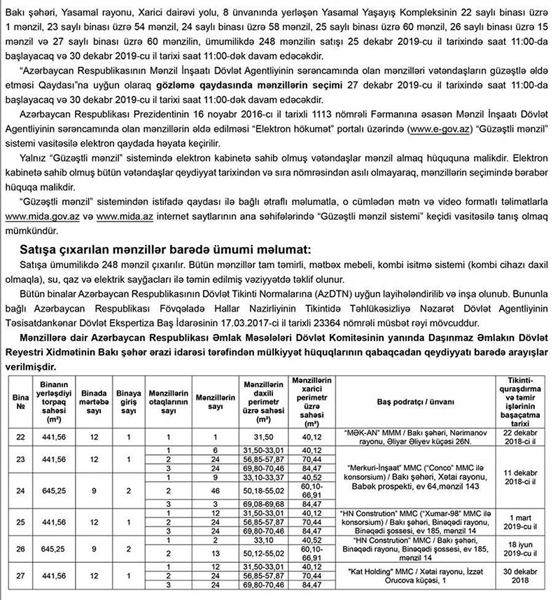 Azərbaycan Respublikası Mənzil İnşaatı Dövlət Agentliyinin ilk layihəsi - Yasamal Yaşayış Kompleksində mənzillərin güzəştlə satışı barədə ELAN