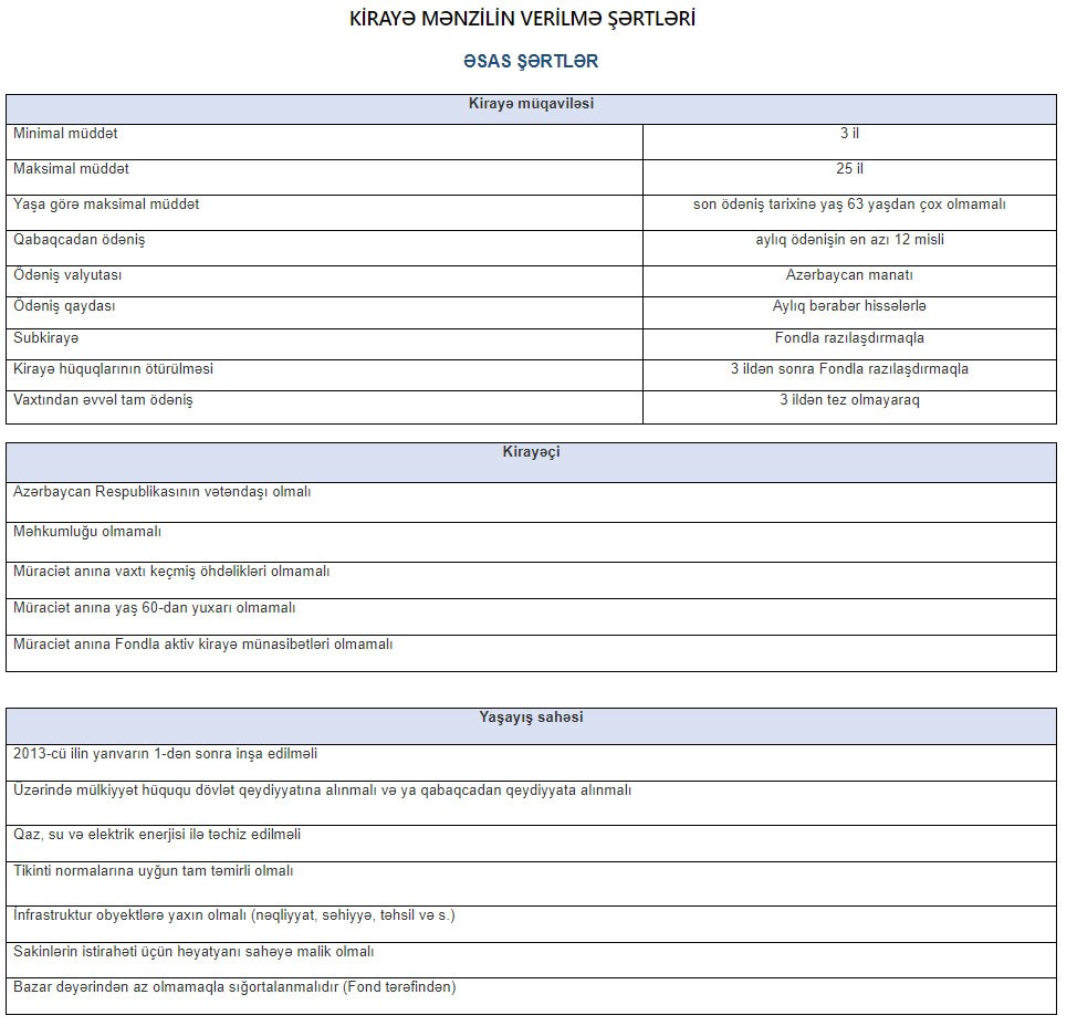 2013-cü il yanvarın 1-dən sonra inşa edilmiş, üzərində mülkiyyət hüququ dövlət qeydiyyatına alınmış və ya qabaqcadan qeydiyyata alınmış çoxmənzilli binalarda yerləşən təmirli yaşayış sahələrini və ya mülkiyyət hüququ daşınmaz əmlakın dövlət reyestrində qeydə alınmış binanın paylarla bağlı tərkib hissəsini, həmçinin Fondun fəaliyyəti ilə əlaqədar Fondun mülkiyyətinə keçmiş yaşayış sahələrini Fond ilə kirayə müqaviləsi bağlayıb kirayə götürmək olar.