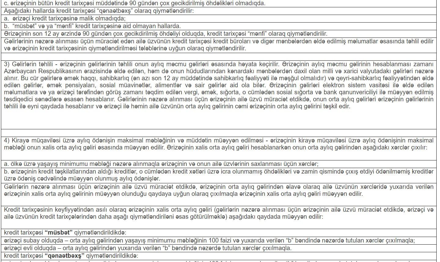 Fondun şərtlərinə və tələblərinə əsasən Sizin kirayə müqaviləsi üzrə aylıq ödənişlərinizin maksimal məbləği kredit tarixçənizin, gəlirlərinizin və xərclərinizin təhlili əsasında müəyyən edilir (müsbət, qənaətbəxş və mənfi kredit tarixçəsi ola bilər). Gəlirlər və xərclər arasında hesablanan fərq nəticəsində yaranan xalis gəlirin məbləğinin əvvəlcədən müəyyən olunmuş faizi nisbətində (müxtəlif kateqoriyalı vətəndaşlar üçün fərqlidir) aylıq ödənişin maksimal məbləği müəyyən edilir və buna uyğun olaraq Sizə müvafiq alış qiyməti ilə yaşayış sahəsini seçmək imkanı verilir. Fond tərəfindən yaşayış sahələrinin kirayə verilməsinin ilk vaxtlarında, vacib infrastruktur obyektlərinə yaxın, sakinlərin istirahət etməsi üçün ümumi həyətyanı sahəsi olan, ekonom tipli yaşayış sahələri seçim üçün təqdim ediləcək.