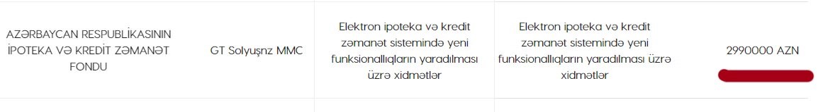 “Marja.az”ın araşdırılmasına görə, Azərbaycan İpoteka və Kredit Zəmanət Fondu 2017-ci ildə Elektron hökumət portalında “Elektron ipoteka” sisteminin yaradılması və tətbiq edilməsinə 5 milyon 988 min 622 manat xərcləyib. Sistem Fondun sifarişi ilə “Cybernet” MMC tərəfindən yaradılıb.