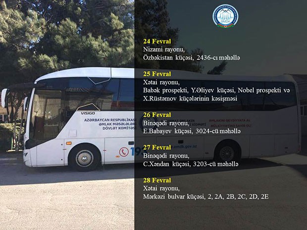 “Əmlakını qeydiyyata al və mülkiyyətinə sahib ol” kampaniyası çərçivəsində təşkil olunan səyyar xidmətdən 24 fevralda Nizami rayonu, Özbəkistan küçəsi, 2436-cı məhəllə ünvanındakı, 25 fevralda Xətai rayonu, Babək prospekti, Y.Əliyev küçəsi, Nobel prospekti və X.Rüstəmov küçələrinin kəsişməsindəki çoxmənzilli binaların sakinləri yararlanacaqlar. Binəqədi rayonunda mobil qeydiyyat 26 fevralda M.Ə.Rəsulzadə qəsəbəsi, məhəllə 3024, E.Babayev küçəsi, 27 fevralda C.Xəndan küçəsi, 3203-cü məhəllədəki binalarda təşkil ediləcək. 28 fevralda isə qeydiyyat xidməti Xətai rayonu, Mərkəzi Bulvar küçəsi 2, 2a, 2b, 2c, 2d, 2e ünvanlarında göstəriləcək.