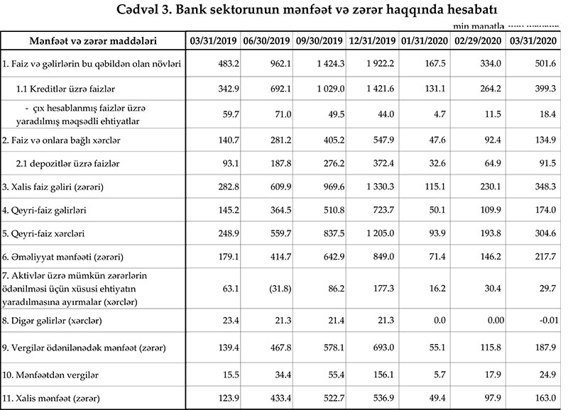 Bank sektoru 2019-cu ilin ilk 3 ayını 163 milyon manat xalis mənfəət ilə başa vurub. Bu, ötən ilin eyni dövrü ilə müqayisədə 31,5% çoxdur. Sektor ötən ilin ilk 3 ayını 123.9 milyon manat xalis mənfəət ilə bağlamışdı.
