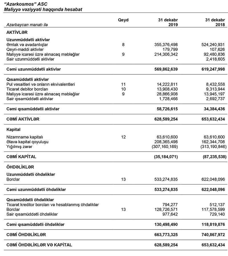 Həmçinin, ümumi öhdəliklər 2018-ci ilə nisbətdə 77,09 milyon manat və ya 10,4% azalaraq 663,77 milyon manata düşüb. “Azərkosmos”un öhdəliklərinin əsasını peyk layihələri ilə bağlı götürülmüş kreditlərin ödənilməsi təşkil edir. Bu kreditlər peyk xidmətlərindən əldə edilən gəlirlər hesabına vaxtlı-vaxtında geri ödənilir və bu günə kimi şirkətin vaxtı keçmiş və ya gecikdirilmiş kredit borcu qeydə alınmayıb.